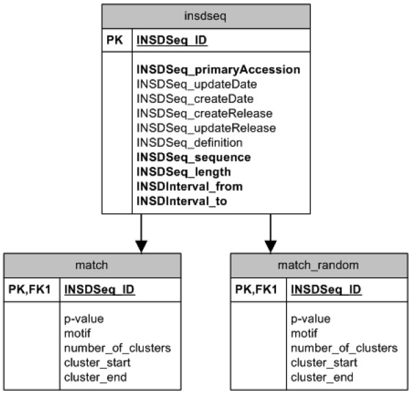 Figure 1. Schematic representation of the information stored in the 3'-UTR SIRF database. Sequences were extracted from the Mammalian Gene Collection (NCBI) and stored in the insdseq table of the database. REPFIND was then used to identify clusters of all perfect repeats in the 3'-UTRs of these sequences. The results of this computational analysis were stored in the 'match' table. A similar table, 'match_random' was generated on the same sequences which had their nucleotides shuffled in a random fashion. All information included in the insdseq table is from the NCBI database, except INSDSeq_Create_release, which defines when the table entry was created and INSDSeq_Update_release, which identifies when the table entry is modified. INSDSeq_ID is used as the identification number into the table. It has the same role as INSDSeq_primaryAccession, but is used because it is an integer that is more efficient for indexing. INSDSeq_ID in the match and match_random tables indicates the gene corresponding to the cluster identified by REPFIND. In addition, the P-value, sequence of the repeat (motif), number of motifs, start (cluster_start), and end (cluster_end) of each cluster are shown. These last two entries are used to calculate the size of each identified cluster.