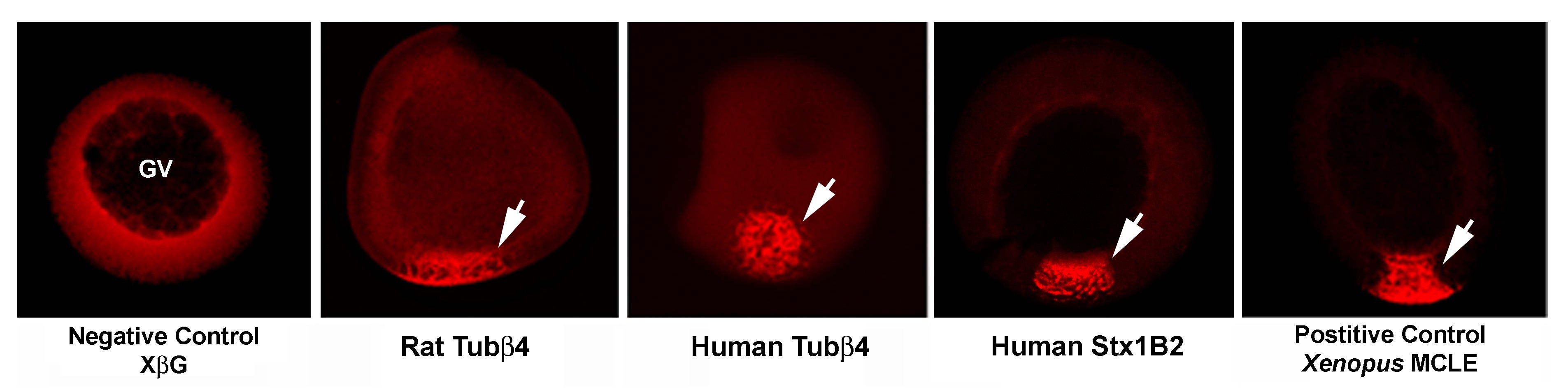 Figure 3. Localization of the Rat and Human Tubβ4 3'-UTRs in Xenopus oocytes. The 3'-UTR of rat or human Tubβ4 (Acc. # 82522352 and BC013683, respectively), and human Stx1B2 (Acc. # BC062298) were synthesized and labelled in vitro with Alexa-Fluor-546-UTP. These fluorescently labelled RNAs were then microinjected into stage II Xenopus oocytes. All three RNAs localize to the vegetal pole, which is oriented downwards in all panels. A fragment of the Xenopus β-globin gene (XβG) was used as a negative control for localization, whereas the mitochondrial cloud RNA localization element from the Xenopus Xcat-2 mRNA (MCLE) was used as a positive control. Note that the extent of Stx1B2 localization is higher than that of either Tubβ4 RNA. Arrows depict the localized RNA towards the vegetal pole and GV indicates the germinal vesicle (nucleus) in these cells which are ~300 μm diameter.
