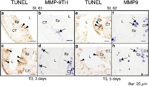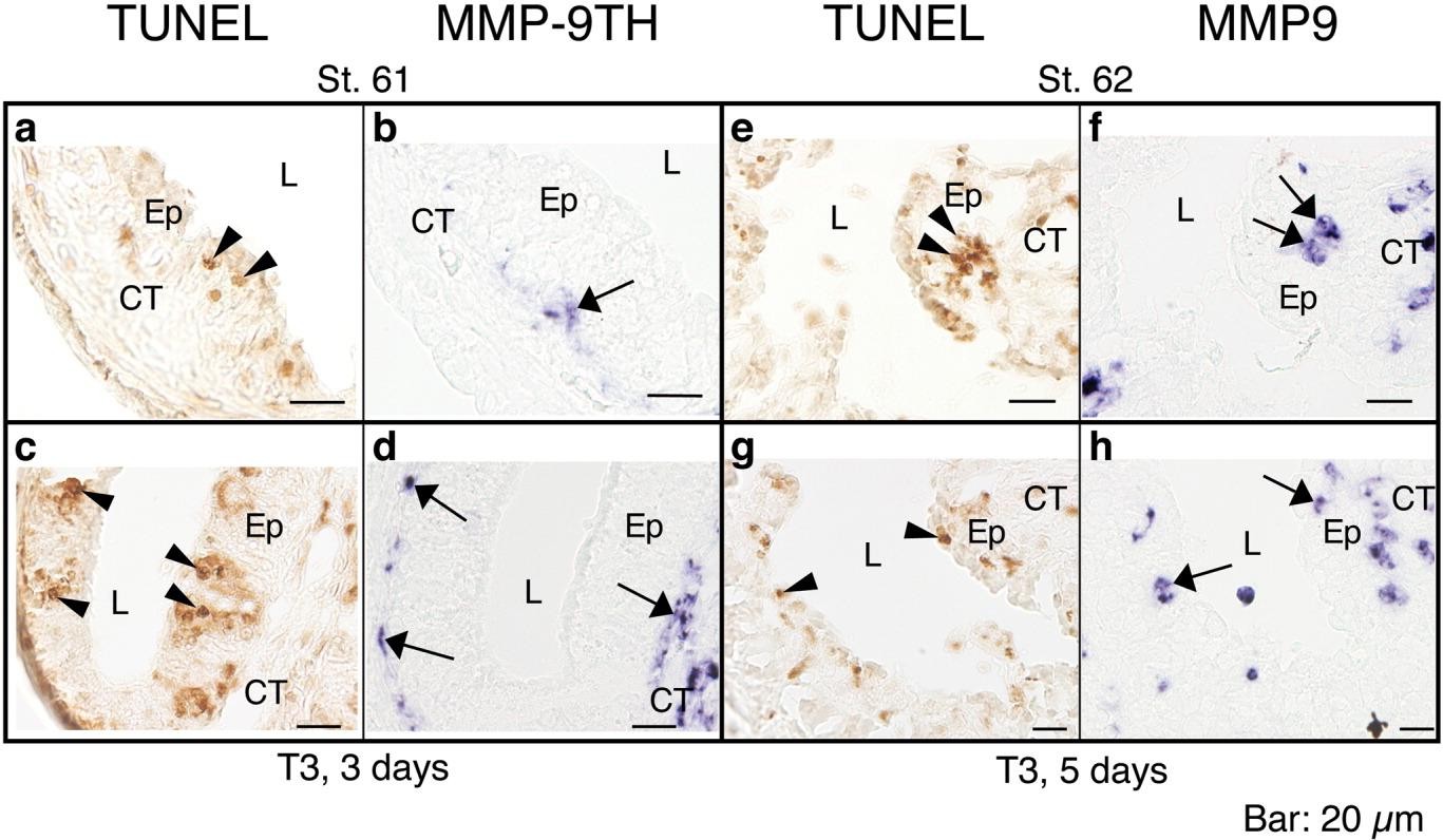 Matrix metalloproteinases (MMPs) play a pivotal role in development and/or pathogenesis through degrading extracellular matrix (ECM) components. We have previously shown that Xenopus MMP-9 gene is duplicated. To assess possible roles of MMP-9 and MMP-9TH in X. laevis intestinal remodeling, we here analyzed their expression profiles by in situ hybridization and show that their expression is transiently up-regulated during thyroid hormone-dependent metamorphosis. Of interest, MMP-9TH mRNA is strictly localized in the connective tissue and most highly expressed just beneath the larval epithelium that begins to undergo apoptosis. On the other hand, cells expressing MMP-9 mRNA become first detectable in the connective tissue and then, after the start of epithelial apoptosis, also in the larval epithelium. These results strongly suggest that MMP-9TH is responsible in the larval epithelial apoptosis through degrading ECM components in the basal lamina, whereas MMP-9 is involved in the removal of dying epithelial cells during amphibian intestinal remodeling.