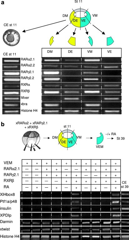 Fig. 2. Differential expression of RARs contributes to the competence to activate pancreas gene expression in response to RA. (a) Stage 11 embryos were dissected to generate dorsal endoderm (DE), dorsal mesoderm (DM), ventralendoderm (VE) and ventralmesoderm (VM). The isolated explants were collected immediately after isolation and subjected to semi-quantitative RT-PCR analysis for expression of various xRARs and xRXRs, as indicated. xRARα2.1 and xRARγ2.1 were found to be predominantly expressed in the dorsal portion of the endoderm and mesoderm, respectively. Xbra and Mixer are markers for controlling the purity of the isolated mesodermal and endodermal explants. (b) xRARγ2.1, either alone or in combination with xRARα2.1, is able to induce a pancreatic fate in the VEM explants in the presence of its co-receptor xRXRβ. xRARγ2.1 (500 pg/embryo), either alone or in combination with xRARα2.1 (500 pg/embryo) or/and xRXRβ (500 pg/embryo) was injected into four vegetal cells of 8-cell stage embryos. Ventralendoderm/mesoderm (VEM) explants were isolated from the injected embryos at stage 11. The isolated VEM was treated with or without 5 μM RA for 1 h right after isolation and cultured until control embryos had reached stage 39. These explants were subjected to semi-quantitative and quantitative RT-PCR analysis for pancreas marker expression. An average of 10 explants per assay was used for each RNA preparation.