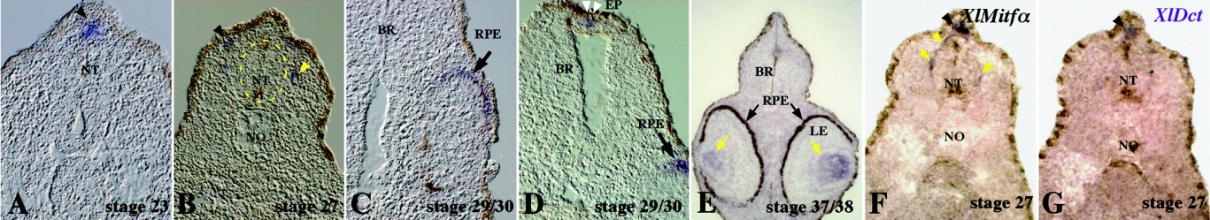 Figure 3. Expression patterns of XlMitf alpha on sections. A-D: Sections of embryos after whole-mount in situ hybridization. A: At stage 23, XlMitf alpha is expressed in cells located on the neural tube (A, black arrowhead). B: At stage 27, XlMitf alpha is expressed in cells located along the medial migration pathway of neural crest cells (yellow arrowhead). XlMitf alpha -positive cells shown by a black arrowhead are thought to have taken either a lateral or a ventral pathway (black arrowhead). C,D: At stage 29/30, XlMitf alpha is expressed in the RPE (black arrows) and epiphysis (white arrowheads in D). E: At stage 37/38, XlMitf alpha expression is detected in the lens (yellow arrows), although that in RPE is decreased. F,G: Serial sections of the trunk of a stage 27 embryo. XlMitf alpha -positive melanoblasts on the neural tube (black arrowhead in F) are also XlDct-positive (black arrowhead in G) in adjacent sections. XlMitf alpha expression is also detected in cells located along the medial pathway (F, yellow arrowheads). The staining in other organ cells not mentioned above, especially in the ectoderm, is background. As for stage 37/38 embryos (E), we performed in situ hybridization on sections to reduce background. BR, brain; EP, epiphysis; LE, lens; NO, notochord; NT, neural tube; RPE, retinal pigment epithelium.