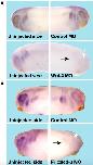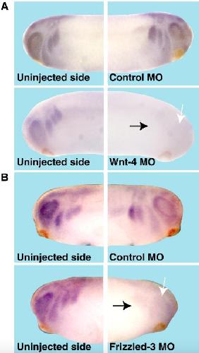 Fig. 2. Expression of pescadillo depends on Wnt-4 and Fz-3. Xenopus laevis embryos were unilaterally injected into one dorsal-animal blastomere at 8-cell stage with either antisense morpholino oligonucleotides (MO) against Wnt-4 (A), Frizzled-3 (B) or a control MO (A, B). Expression of pescadillo was visualized by whole-mount in situ hybridization. Expression of pescadillo in the eye (white arrows) and the cranial neural crest cells (black arrows) depends on Wnt-4 as well as Frizzled-3 function.