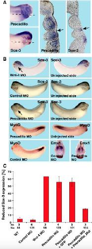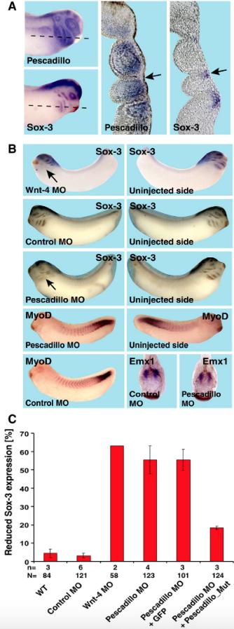 Fig. 8. Pescadillo affects Sox-3 expression in branchial arches. (A) Pescadillo is expressed in the neural crest cell derived part of the branchial arches, whereas Sox-3 is expressed in the pharyngeal pouches within the endodermal layer that touches the outer ectodermal layer. More dorsally, Sox-3 is expressed in the lateral line placode and the otic placode (Schlosser and Ahrens, 2004). (B) Unilateral injection of Wnt-4 MO or pescadillo MO but not control MO results in a reduction of Sox-3 expression in the branchial arches. Neither pescadillo MO nor control MO affects expression of MyoD or Emx1 at stage 32. (C) Statistical evaluation of embryos with reduced Sox-3 expression at stage 32 after unilateral injection of pescadillo or Wnt-4 MO. Pescadillo _Mut RNA can revert the pescadillo MO effect on Sox-3 expression. n = Number of independent experiments. N = number of embryos examined in total. Error bars indicate standard error of the mean.