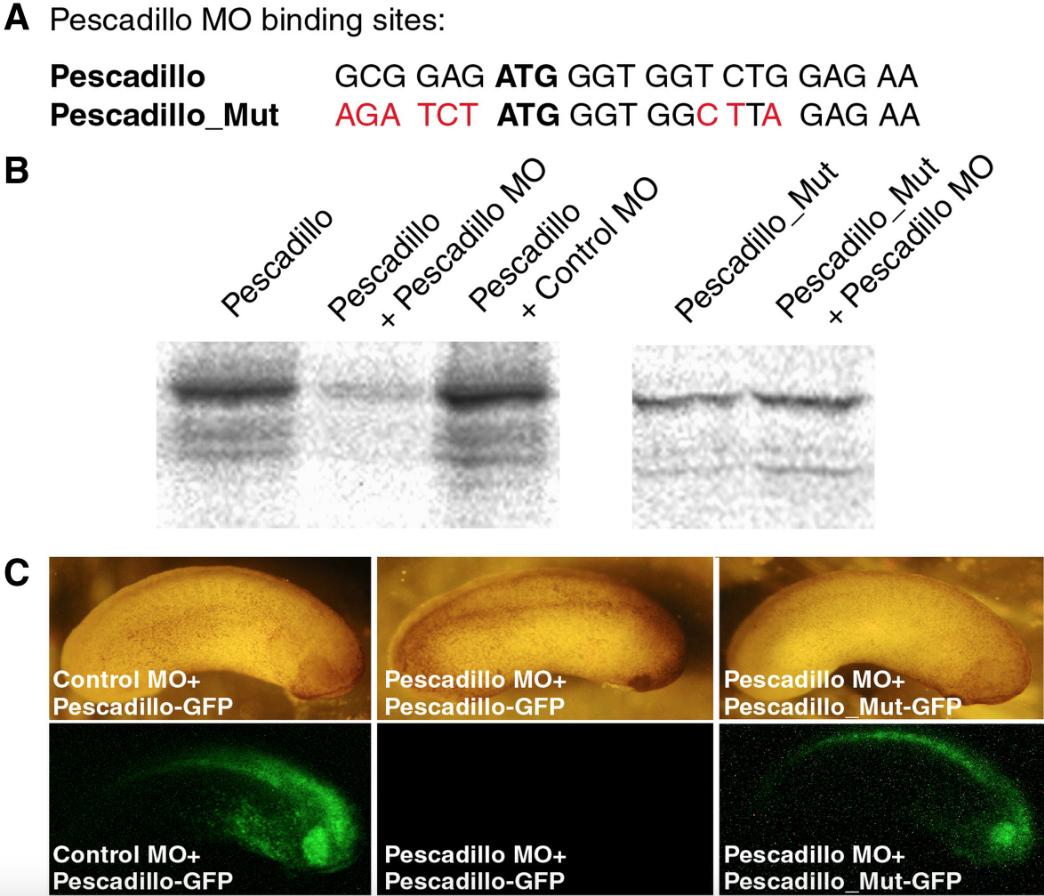 Fig. 3. Characterization of an antisense morpholino oligonucleotide directed against Xenopus laevis pescadillo. (A) Binding site of the pescadillo MO within the pescadillo mRNA. The ATG start codon is highlighted. Sequence of the pescadillo_Mut RNA in which 9 nucleotides have been changed as indicated in red. (B) Coupled transcription and translation using radioactively labeled methionine. Plasmids encoding pescadillo or pescadillo_Mut were used as indicated. Morpholino oligonucleotides were added as indicated. Pescadillo MO but not a control MO interferes with translation of the pescadillo RNA. Pescadillo MO does not block translation of Pescadillo_Mut. (C) Efficiency of pescadillo MO was also tested in whole embryos. Oligonucleotides representing the sequences as given in panel A were cloned in frame to and in front of GFP. RNA coding for the corresponding constructs (pescadillo-GFP or pescadillo_Mut-GFP) was injected together with pescadillo MO or control MO as indicated. GFP expression was monitored at stage 25. Pescadillo MO but not control MO interfered with translation of Pescadillo-GFP. Pescadillo_Mut-GFP was not targeted by pescadillo MO.
