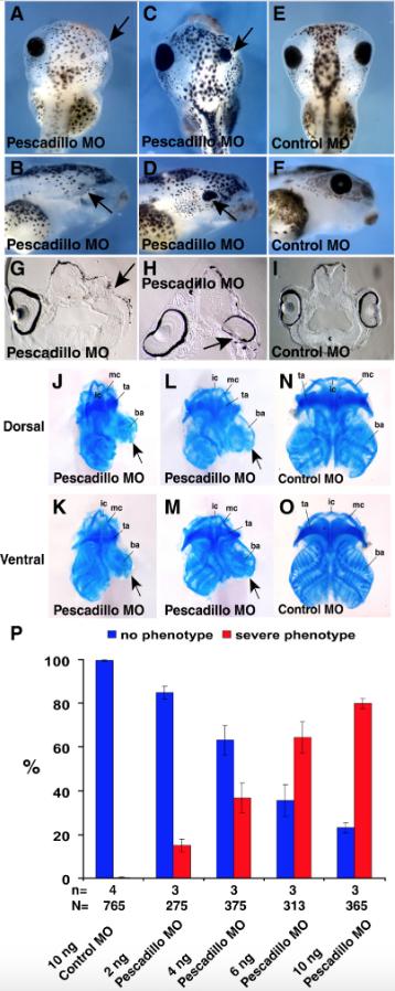 ???displayArticle.abstract??? Pescadillo is a multifunctional, nuclear protein involved in rRNA precursor processing, ribosomal assembly, and transcriptional regulation. Pescadillo has been assigned important functions in embryonic development and tumor formation. We previously identified pescadillo as a potential downstream target of non-canonical Wnt-4 signaling. Here we have investigated for the first time the function of the Xenopus laevis homolog of pescadillo during early embryogenesis on a molecular level. Loss of function analysis indicates that pescadillo is required for eye development and neural crest migration. BrdU incorporation and TUNEL assays indicate that a loss of pescadillo function affects proliferation and triggers apoptosis through a p53-mediated mechanism. Furthermore, pescadillo affects the expression of early eye-specific marker genes, likely independent of its function in regulating proliferation and apoptosis, and in addition migration of cranial neural crest cells. Our data indicate that pescadillo has multiple important functions during X. laevis development and that its function is highly conserved among different species.