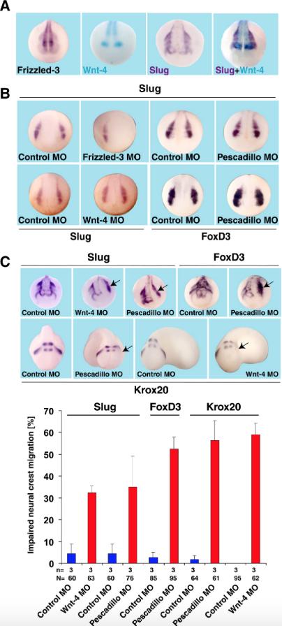 Fig. 9. Pescadillo interferes with cranial neural crest migration but not specification. (A) Whole-mount in situ hybridization indicates a partial coexpression of Slug and Wnt-4 at stage 19. Frizzled-3 is expressed throughout the whole anterior neural plate with different intensities. (B) Frizzled-3 MO but not Wnt-4 MO, pescadillo MO or control MO interferes with slug expression at stage 17. Pescadillo MO does not interfere with FoxD3 expression at stage 17. (C) Unilateral injection of Wnt-4 MO and pescadillo MO results in a neural crest cell migration defect as indicated by staining for slug (stage 20) and Krox20 (stage 23/24). In case of pescadillo MO, FoxD3 was used as an additional marker (stage 20). Staining for FoxD3 indicates that neural crest cells stay in the dorsal part of the embryo and do not migrate towards the ventral side. A statistical analysis of these experiments is given at the bottom of the panel C. n = Number of independent experiments. N = number of embryos examined in total. Error bars indicate standard error of the mean.