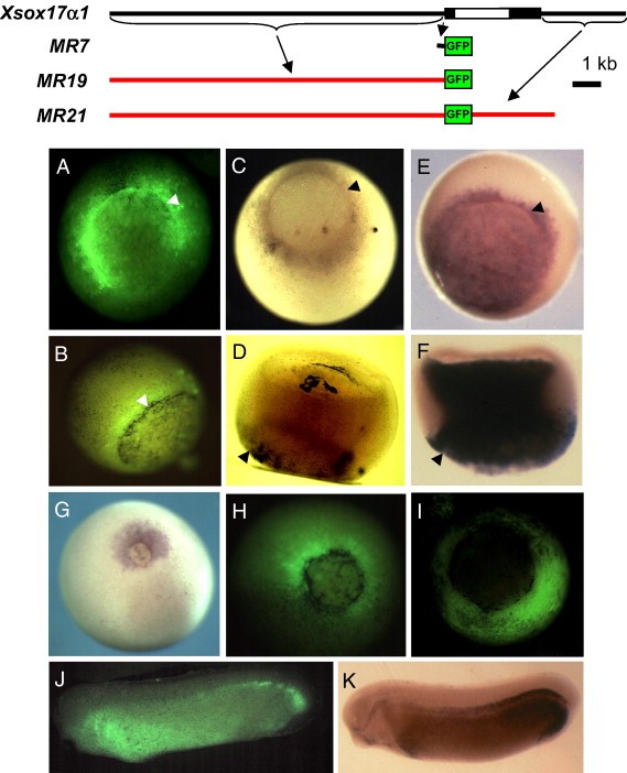 Fig. 1. Initial transgenics made with large fragments of the Xsox17α1 promoter. Top: Map of the endogenous gene, with its single intron, and below are maps of two GFP constructs with large fragments of the Xsox17α1 promoter (red), and also a small promoter fragment with just 260 bp of upstream sequence (black). (A, B) Fluorescent expression of the MR21 construct in stage 10.5 gastrulae. (C) In situ hybridisation to GFP mRNA from MR19 in an embryo similar to that in panels A, and (D) an optical section of this embryo after clearing. (E, F) In situ to the endogenous Xsox17 transcripts for comparison. The blastopore lip is marked by an arrowhead in panels AâF. At stage 12, the endogenous gene is expressed as in panel G, and the MR21 GFP is shown in panel H. A minimal promoter, with only 260 bp of 5â² sequence is not expressed in the vegetal region (I), but it is expressed elsewhere. (J) MR21 is expressed throughout the endoderm at tailbud stages, just like the endogenous gene, as shown in an in situ hybridisation (K). The arrowheads mark the blastopore.