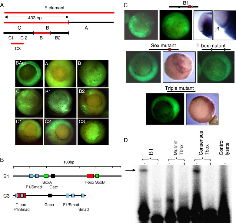 Fig. 3. (A) Dissection of the E-element. At the top are the sub-regions of the E-element that were tested in GFP transgenics, attached to a cytoskeletal-type muscle actin basal promoter. All constructs except C3 overlapped to avoid disrupting a possible control element. Images of the transgenics are shown below, labelled by construct, the basal promoter alone being labelled BAct (Latinkic et al., 2002). Expression of the entire E-element is shown in Fig. 2J. (B, C) Mutational analysis of the B1 element. In panel B are maps of selected transcription factor binding sites in B1, and also C3. The sequences of B1 and C3 are shown in Supplementary Fig. 3. In panel C is a transgenic analysis of mutants of B1 in which the transcription factor binding sites were disrupted. The green panels show GFP fluorescence and the others show in situ hybridisation to GFP mRNA. The third B1 panel shows a cleared embryo, with GFP expression in the deep involuting endoderm and also the extra-blastoporal, epithelial, involuting endoderm, enlarged in the fourth panel. The arrow indicates the blastopore lip. (D) Electrophoretic mobility shift analysis of B1 T-box motif. EMSA assays were conducted with the variant VegT-binding sequence in B1, with a mutant of it and with the consensus sequence in the Derrière gene. In each case, the reactions were performed with or without competitor (±).