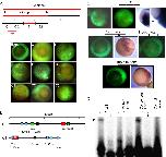 Fig. 2. Transgenic expression of deletion constructs. Top: Diagrams of a series of 5â² and internal deletion fragments fused to GFP, as in Fig. 1. The endodermal element is marked and fragments giving vegetal expression in the early gastrula are colored red. Below is GFP expression in various transgenics, with the corresponding expression panels indicated on the left of the constructs. (A, D, G, J, K) are stage 10.5; (B, E, H) are stage 12; (C, F, I, L) are tailbud stages. (AâC) Construct â 12δ10-5 is negative in early endoderm. (DâF) Positive construct â 10; the embryo in (D) is a hemi-transgenic, providing a good control for the background fluorescence; the insert panel is the animal pole at the same exposure. (GâH) Positive construct â 10.5δ7.7-5. (I) Construct â 5.7 is positive in the later foregut, as well as in the axis, like other 5â² constructs; (J) â 9.5δ8.4-1.7 is positive in the involuting and non-involuting endoderm, whereas â 7.5 is not (K), but it gives low-level expression in the posteriorendoderm of the tailbud (L). In panel J, the main tissues of the early gastrula are marked: end, endoderm; ect, ectoderm; ee, the extra-blastoporal endoderm, which involutes over the blastopore.