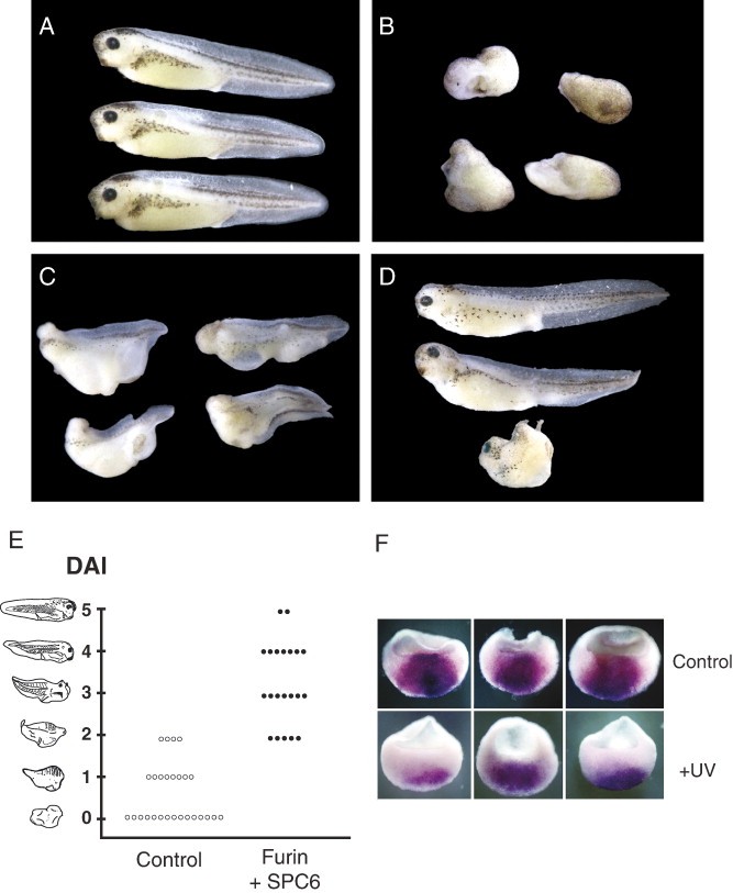Fig. 6. Vegetal expression of Furin and SPC6 can restore a normal dorsal axis to UV-ventralized Xenopus embryos. UV-treated embryos were injected in a vegetal blastomere at the 4 cell (B, D and E) or 8-cell stage (C). (A) Control noninjected, non-UV-irradiated stage 37/38 embryos. (B) UV-irradiated embryos injected with 1 ng GFP mRNA showing DAIs of 0â2. (C) UV-irradiated embryos injected vegetally with 450 pg Furin and 450 pg SPC6 mRNA at the 8-cell stage showing DAIs ranging from 2 to 3. (D) UV-irradiated embryos injected vegetally with 450 pg Furin and 450 pg SPC6 mRNA at the 4-cell stage exhibiting DAIs of 4â5. All embryos were allowed to develop until control non-UV-treated embryos reached stage 37/38. The representative rescued embryos shown in panel D have anterior structures, including eyes, cement gland, and neural crest-derived pigmented cells. (E) The frequency distribution of DAI scores for a representative experiment is shown, each dot corresponds to a single embryo. These experiments were performed six times, in which 0/150 of the control, UV-irradiated embryos had a DAIÂ >Â 2. (F). Whole mount hybridization in situ of Vg1 mRNA in hemisected control and UV-irradiated stage 9 Xenopus embryos.