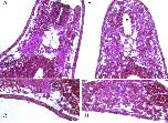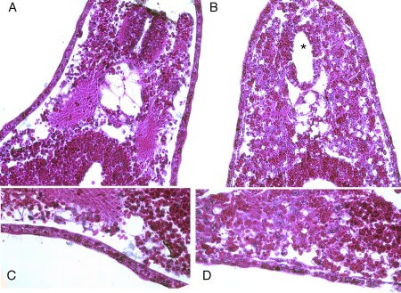 Figure 4. Histology of FoxC1-depleted embryos at the late tailbud stage. Embryo-derived FoxC1-depleted embryos (B,D) have disorganized somites and undifferentiated neural tubes (asterisk in B) compared to controls (A,C), while notochord differentiation appears normal. C and D are higher magnification images of parts of A and B, respectively, showing the loss of close adhesion between the simple squamous epithelium of the lateral plate mesoderm and the epidermis in FoxC1-depleted embryos (D) compared to controls (C).