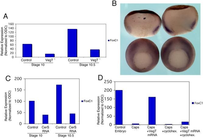 Figure 1. FoxC1 is an indirect target of VegT and FoxC1 expression in the equatorial zone. A: VegT-depleted gastrulae (early gastrula, stage 10; mid gastrula, stage 10.5) showed a decrease of FoxC1 expression using real time RT-PCR compared to control sibling embryos. Levels of expression are normalized to ornithine decarboxylase (ODC).B: Using whole-mount in situ hybridization, FoxC1 was shown to be localized in the equatorial zone of wild-type embryos at the mid-gastrula stage (stage 11). The upper two half-embryos seen in hemisection through the blastopore; lower two whole embryos, viewing the blastopore. C: After CerS mRNA injection at the 2-cell stage, FoxC1 expression measured by real time RT-PCR is reduced in wild type gastrulae, at the early and mid-gastrula stage. D: The expression of FoxC1 in 1 whole embryo compared to batches of 10 wild type animal caps (Caps), 10 caps injected with 60 pg VegT mRNA at the two cell stage (Caps + VegT mRNA), 10 wild type caps treated with cycloheximide (Caps + cyclohex), and 10 caps injected with VegT mRNA and treated with cycloheximide (Caps + VegT + cyclohex). Wild-type animal caps do not express FoxC1, while injection with VegT mRNA induces FoxC1 expression. Injection of cycloheximide in addition to VegT mRNA into animal caps represses FoxC1 expression.