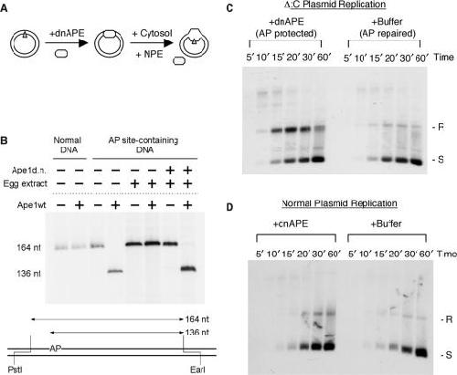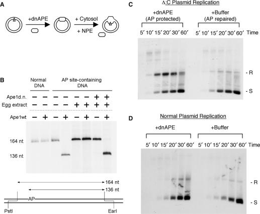 Figure 1. Establishment of the AP lesion replication system. (A) Experimental design for AP lesion replication. A plasmid DNA that carries a synthetic AP site (Δ) is first incubated with the dominant negative human APE (dnAPE) to protect the AP lesion and then with cytosol to assemble the pre-replication complex. Replication was initiated by the addition of NPE and monitored by 32P dATP. (B) Protection of AP containing DNA by dnAPE. The presence of AP site was detected by digestion with restriction enzymes PstI and EarI plus or minus AP endonuclease (wtApe). The EarI ends were then filled in with 32P TTP by Klenow and the DNA fragments were separated on a 5% urea polyacrylamide gel. (C) The replication of the AP lesion-containing DNA. Δ:C plasmid was replicated in the presence of dnAPE (AP lesion protected) or buffer (AP lesion repaired). Samples taken at the indicated times were de-proteinized with SDS and proteinase K and separated on a 1% TAE agarose gel and the gel was dried for exposure to phosphoimager. R: relaxed; S: supercoiled; L: linear. (D) Effect of dnAPE on the replication of the normal plasmid DNA pBS-Trx. The DNA was replicated in the presence of dnAPE or buffer and analyzed in the same way as in (C).