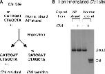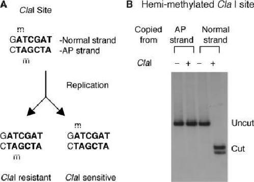 Figure 3. Effect of ClaI hemi-methylation. (A) The predicted methylation pattern of the ClaI site in Δ:C after one round of replication. (B) ClaI digestion of the two hemi-methylated, ClaI-containing NdeI fragments copied from Δ:C.