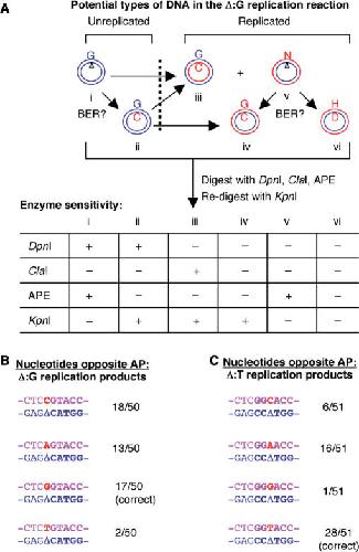 Figure 6. Analysis of the replication products that still carried the AP lesion (after 75 min of incubation in NPE). (A) Six potential types of DNA and their sensitivity to various enzymes. The lesion-carrying DNA would be nicked on the AP strand but intact on the complementary strand. BER: base excision repair; H: non-G; D: non-C. (B) Sequence analysis of the cloned PCR products amplified from Δ:G replication products that had been digested with DpnI, ClaI, APE and KpnI. (C) Sequence analysis of the cloned PCR products amplified from Δ:T replication products that had been digested with DpnI, ClaI, APE and KpnI.