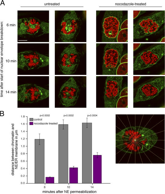 During prophase, vertebrate cells disassemble their nuclear envelope (NE) in the process of NE breakdown (NEBD). We have established an in vitro assay that uses mitotic Xenopus laevis egg extracts and semipermeabilized somatic cells bearing a green fluorescent protein-tagged NE marker to study the molecular requirements underlying the dynamic changes of the NE during NEBD by live microscopy. We applied our in vitro system to analyze the role of the Ran guanosine triphosphatase (GTPase) system in NEBD. Our study shows that high levels of RanGTP affect the dynamics of late steps of NEBD in vitro. Also, inhibition of RanGTP production by RanT24N blocks the dynamic rupture of nuclei, suggesting that the local generation of RanGTP around chromatin may serve as a spatial cue in NEBD. Furthermore, the microtubule-depolymerizing drug nocodazole interferes with late steps of nuclear disassembly in vitro. High resolution live cell imaging reveals that microtubules are involved in the completion of NEBD in vivo by facilitating the efficient removal of membranes from chromatin.