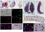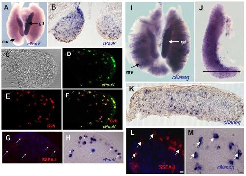 Fig. 5. cPouV and cNanog are expressed in germ cells during later embryonic development. (A-H) At stage 33, cPouV mRNA is detected in the developing gonad, which is attached to the mesonephros (A,B), in the germ cells (D), as detected by co-localisation (F) of cPouV (D) both with Cvh (chicken Vasa, E) expression and with SSEA-1-positive cells (G) revealed on adjacent sections counterstained by Hoechst and cPouV probe (H, arrows). (B) Section of gonad shown in A. (C) Bright field of the stage 33 gonad used for in situ hybridisation (D,E,F). (I-M) At stage 33, cNanog is highly expressed in gonads and in mesonophros tubules (I) and gonad (I,J), especially in germ cells (K), as revealed by SSEA-1 staining (L) on the same cells that express cNanog in adjacent sections (M, arrow) counterstained by Hoechst (L). (K) Section of dissected gonad from the urogenital tract (J). ms, mesonephros; gd, gonads. Scale bars: 15 μm.