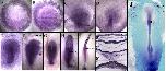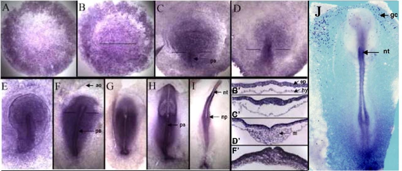 Fig. 3. cPouV expression during chick embryo development. (A-J) Whole-mount in situ hybridisation to cPouV transcripts. Transcripts are detected in the area pellucida and area opaca of the epiblast in pre-streak embryos (A, stage XI; B, stage XIII), and in the hypoblast in a salt-and-pepper manner (Bâ²). At stage XIV (C), the expression is very strong in the area pellucida of the epiblast, especially where the streak is forming (Câ²). Transcripts are expressed in the ingressing mesoderm at stages 2-3 (D,Dâ²). As the primitive streak elongates and the embryo grows, expression is still detected in the ectoderm and mesoderm (E, stage 3+; F,Fâ², stage 4+; G, stage 5). At stage 7 (H) and 8 (I), cPouV mRNA is detected in the forming neural tube and in the underlying mesoderm, but is absent from the endoderm (data not shown). At stage 9 (J), cPouV mRNA is expressed in neural tissue (nt) and presumptive migrating germ cells (gc). Bâ²,Câ²,Dâ²,Fâ² are transverse sections of the embryos in B,C,D,F, respectively. ao, area opaca; ep, epiblast; gc, germ cells; hy, hypoblast; m, mesoderm; np, neural plate; nt, neural tube; ps, primitive streak.