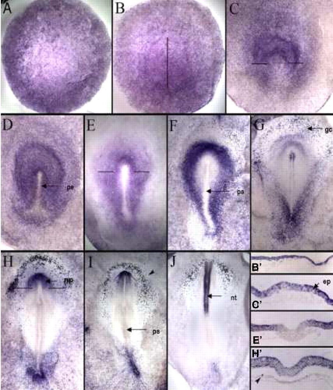 Fig. 4. cNanog expression during chick embryo development. (A-J) Whole-mount in situ hybridisation to cNanog transcripts. Nanog transcripts are localised in the epiblast of the area pellucida and area opaca of the pre-streak embryo (A, stage XI; B, stage XII), but not in the hypoblast (Bâ²). From stage XIV, cNanog mRNA disappears from the posterior area pellucida (C,Câ²) and from the growing primitive streak (D, stage 3; E,Eâ², stage 3+; F, stage 4+). cNanog transcripts are downregulated in the epiblast from stage 4+ (F), and are confined anteriorly in a crescent region in the epiblast (G, stage 5+). At stage 6 (H), expression is restricted to the neural plate and the neural tube (I, stage 7; J, stage 8). cNanog is also expressed in scattered cells in the germinal crescent from stage 4 (arrowhead in I and Hâ²). Bâ² is a longitudinal section of the embryo in B, anterior at the right; Câ²,Eâ²,Hâ² are transverse sections of embryos in C,E,H, respectively. ep, epiblast; gd, gonad; ms, mesonephros; np, neural plate; nt, neural tube; ps, primitive streak.