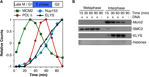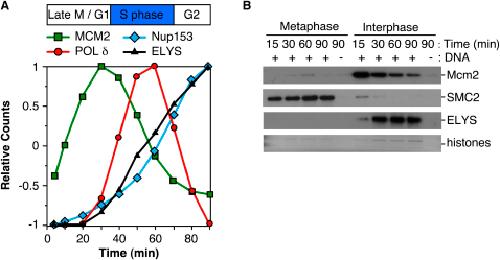 Figure 1. ELYS/MEL-28 Is a Chromatin-Associated Protein(A) Chromatin was isolated from egg extract at discrete time points throughout interphase and subjected to LC-MS/MS. The relative abundance of ELYS/MEL-28, polymerase δ, Mcm2, and Nup153 are indicated. The duration of S phase in this extract is indicated above the graph.(B) Sperm chromatin was incubated in either a metaphase or interphase egg extract. At the indicated times, chromatin was isolated and immunoblotted for Mcm2, SMC2, and ELYS. As a control, extract was incubated without sperm chromatin for 90 min. The lower portion of the gel was stained with Coomassie blue so that the level of histones could be determined as a control for chromatin recovery.