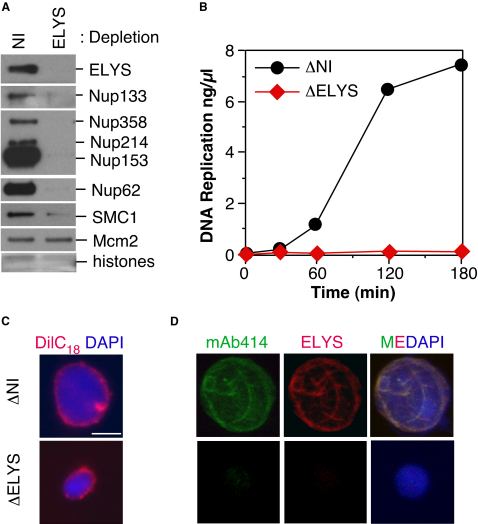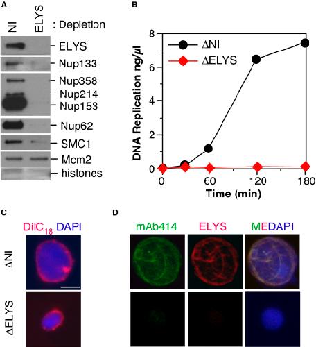 Figure 2. ELYS Is Required for Nuclear Pore Complex Assembly(A) Sperm chromatin was incubated in nonimmune or ELYS-depleted egg extract for 90 min. Chromatin was then isolated and immunoblotted for ELYS, Nups133, 358, 214, 153, 62, and Mcm2. The lower portion of the gel was stained with Coomassie blue so that the level of histones could be determined as a control for chromatin recovery.(B) DNA synthesis was assayed in nonimmune and ELYS-depleted extracts.(C) Sperm chromatin was incubated in nonimmune or ELYS-depleted egg extract treated with 10μg/ml DilC18 (red). Nuclei were fixed and spun onto coverslips and counterstained with DAPI (blue). The scale bar represents 10 μm.(D) Nuclei assembled in nonimmune or ELYS-depleted egg extract were fixed, spun onto coverslips, and stained with mAb414 (green) and ELYS antibodies (red) and DAPI (blue).