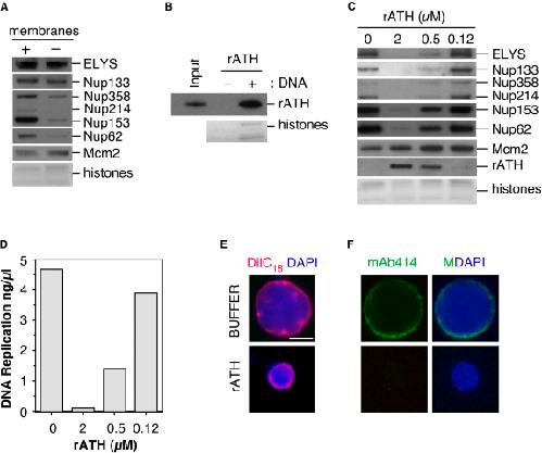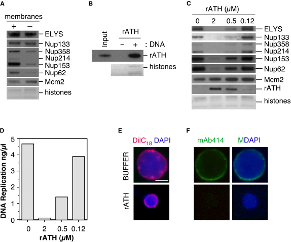 Figure 3. ELYS Chromatin Association Directs Nuclear Pore Complex Assembly(A) Sperm chromatin was incubated in complete or membrane-free egg extract for 60 min. Chromatin was isolated and immunoblotted for ELYS, Nups133, 358, 214, 153, 62, and Mcm2. The lower portion of the gel was stained with Coomassie blue so that the level of histones could be determined as a control for chromatin recovery.(B) rATH was incubated in the presence or absence of sperm chromatin for 30 min. Chromatin was isolated and immunoblotted for rATH. The lower portion of the gel was stained with Coomassie blue so that the level of histones could be determined as a control for chromatin recovery. Twenty-five percent of input rATH is shown as control for protein recovery.(C) Sperm chromatin was incubated for 90 min in egg extract treated with either buffer alone or rATH at the indicated concentrations. Chromatin was isolated and immunoblotted for rATH, ELYS, Nups133, 358, 214, 153, 62, and Mcm2. The lower portion of the gel was stained with Coomassie blue so that the level of histones could be determined as a control for chromatin recovery.(D) DNA synthesis was assayed in rATH-treated extracts.(E) Sperm chromatin was incubated in extract treated with 10 μg/ml DilC18 (red) and either buffer or 2 μM rATH. Nuclei were fixed and spun onto coverslips and counterstained with DAPI (blue). The scale bar represents 10 μm.(F) Nuclei assembled in egg extract treated with buffer alone or 10μM rATH were fixed, spun onto coverslips and stained with mAb414 (green) and DAPI (blue).