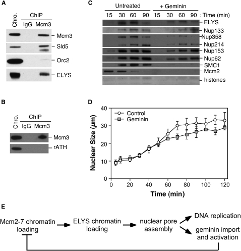 Figure 4. ELYS Interacts with the Replication Licensing System(A) Sperm chromatin was incubated in egg extract for 45 min. Chromatin was then isolated by centrifugation through a sucrose cushion, digested with nuclease, and immunoprecipitated with either nonimmune IgG or Mcm3 antibodies. Precipitated proteins were immunoblotted with antibodies to Mcm3, Sld5, Orc2, or ELYS. An equal sample of chromatin is shown as control for protein recovery.(B) Chromatin isolated from rATH-treated egg extract was digested with nuclease and immunoprecipiated with either nonimmune IgG or Mcm3 antibodies as in (A). Precipitated proteins were identified with antibodies to Mcm3 and rATH.(C) Sperm chromatin was incubated in egg extract treated with buffer alone or 50 nM gemininDEL. At the indicated times, chromatin was isolated and immunoblotted for ELYS, Nups133, 358, 214, 153, 62, SMC1, and Mcm2.(D) Sperm chromatin was incubated in egg extract treated with buffer alone or gemininDEL. At the indicated times, the size of randomly selected nuclei were measured. Values are shown ± the standard deviation.(E) Model for the interaction of ELYS with the replication licensing system.