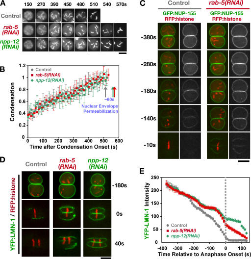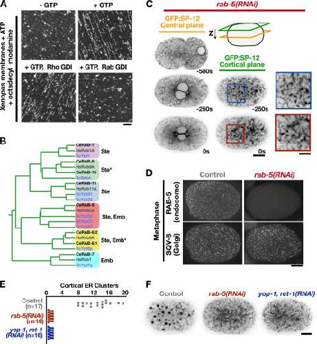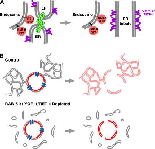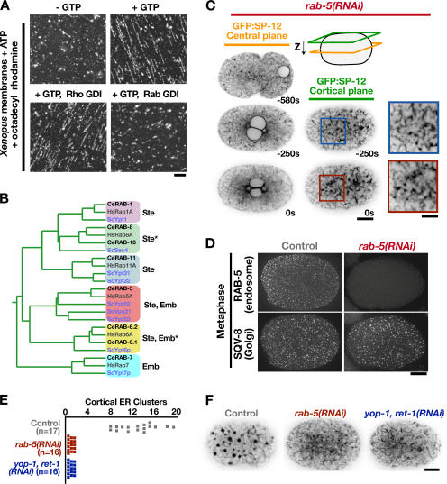 The endoplasmic reticulum (ER) is a contiguous network of interconnected membrane sheets and tubules. The ER is differentiated into distinct domains, including the peripheral ER and nuclear envelope. Inhibition of two ER proteins, Rtn4a and DP1/NogoA, was previously shown to inhibit the formation of ER tubules in vitro. We show that the formation of ER tubules in vitro also requires a Rab family GTPase. Characterization of the 29 Caenorhabditis elegans Rab GTPases reveals that depletion of RAB-5 phenocopies the defects in peripheral ER structure that result from depletion of RET-1 and YOP-1, the C. elegans homologues of Rtn4a and DP1/NogoA. Perturbation of endocytosis by other means did not affect ER structure; the role of RAB-5 in ER morphology is thus independent of its well-studied requirement for endocytosis. RAB-5 and YOP-1/RET-1 also control the kinetics of nuclear envelope disassembly, which suggests an important role for the morphology of the peripheral ER in this process.