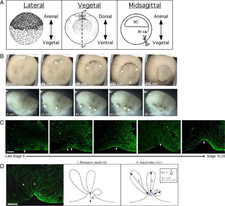 previous termXenopusnext term laevis bottle cell formation. (A) Embryo orientation. Lateral illustration (left panel, Stage 8) and vegetal illustration (middle, Stage 10) from Nieuwkoop and Faber (1994). Dotted line through vegetal view shows the mid-sagittal plane. Abbreviations: DMZ, dorsal marginal zone; BC, blastocoel; Br.c, Brachet's cleft; BP, blastopore. (B) Time-lapse images of bottle cell formation in a whole embryo (top) and in a dorsalateral marginal zone explant. Time elapsed (in minutes) noted in the bottom left-hand corner of each panel. Small arrows point to sites of bottle cell formation. Movies of this embryo and explant can be found in the Supplementary materials. (C) Confocal midsagittal images of DMZs stained with α-tubulin antibody from late stage 9 (left) to stage 10.25 (right) showing progression of bottle cell formation (small arrows) and blastopore groove formation. In this and all DMZ midsagittal views, embryos are oriented with vegetal to the left and apical side down. (D) Measuring apical constriction. Left panel shows a confocal image of a midsagittal section of a DMZ stained with α-tubulin antibody. Asterisks indicate cells undergoing apical constriction, which are illustrated in middle and right panels. Blastopore depth (d), indicated by the length of the arrow in the middle panel. The right panel illustrates the apical index (AI), which is the cell length (l) divided by the apical width (aw). Scale bar = 50 μm.