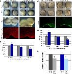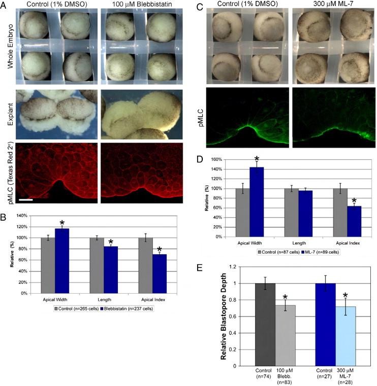 Myosin function is required for blastopore groove formation and efficient constriction. (A) Blebbistatin-treated whole embryos (top right) and explants (middle right) make bottle cells but exhibit weak apical constriction compared to control (left panels). Bottom row of pictures show control and blebbistatin-treated embryos immunostained with pMLC primary antibody and Texas Red secondary antibody. The Texas Red secondary antibody results in nonspecific staining, allowing visualization of cell outlines for quantitative analysis (compare with Alexa 488 secondary shown in [Fig. 2] and [Fig. 4], and Supplementary Figs. 2A, B; see Materials and methods). (B) Apical width, cell length, and apical index in control versus blebbistatin-treated bottle cells. Asterisks denote p ⤠0.001. (C) ML-7 treatment results in shallower blastopore invagination (top) and reduced pMLC staining. (D) Apical width, cell length, and apical index in control versus ML-7-treated bottle cells. (E) Blebbistatin and ML-7 treatment both result in significantly shallower blastopore depths compared to controls. Error bars = 2S.E.; p ⤠0.001 for both control vs. blebbistatin and control vs. ML-7. Scale bar = 50 μm.