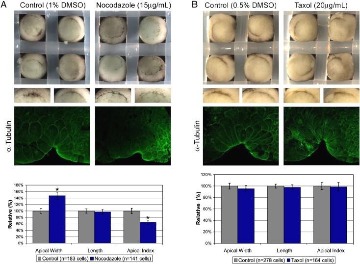 Intact microtubules are required for efficient apical constriction, but not elongation, of bottle cells. (A) Nocodazole affects bottle cell formation by affecting apical constriction. Middle panels show morphological differences between the bottle cells forming in control versus in nocodazole-treated embryos. Nocodazole treatment disrupts α-tubulin staining. Bar graph shows quantitation of bottle cell morphology. Only apical width and apical index are significantly different in presence of nocodazole (p ⤠0.0001). (B) Taxol stabilizes microtubules (see also Supplementary Fig. 6) without affecting blastopore formation or bottle cell morphology. Error bars = 2S.E.