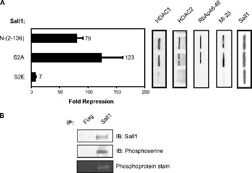 The multizinc finger transcription factor Sall1 is a critical developmental regulator that mediates repression through the recruitment of the nucleosome remodeling and deacetylase (NuRD) complex. Although a short conserved peptide motif in Sall1 is sufficient to recruit NuRD, its ability to regulate native Sall1 target genes in vivo has not been demonstrated. In this report, we demonstrate an in vivo role for the Sall1 repression motif and describe a novel direct target gene of Sall1, Gbx2, that is directly repressed in a NuRD-dependent fashion. The ability of Sall1 to repress Gbx2 was impaired in Xenopus embryos expressing mutant forms of Sall1 that are defective for NuRD binding. Finally, we demonstrate that protein kinase C phosphorylates serine 2 of the Sall1 repression motif and reveal that a phosphomimetic mutation of serine 2 disrupts the ability of Sall1 to repress Gbx2 in cell culture and Xenopus embryos. Together, these studies establish that Sall1 recruits NuRD via the Sall1 repression motif to mediate repression of a native target gene and suggest a model in which dynamic control of gene expression by Sall1 is modulated by serine phosphorylation of the Sall1 repression motif.