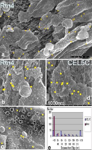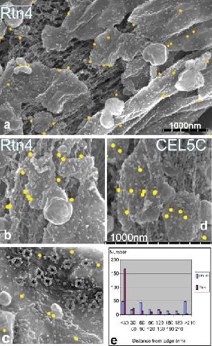 Fig. 6. Membranes flattening onto chromatin during the early (a, b and d) stages of NE assembly in Xenopus egg extracts and labelled with antibodies to Rtn4a (a–c) or ribophorin (antibody CEL5C), marked by circles (d). (c) Fully assembled NE labelled for Rtn4a. (d) Quantification of gold labels for the two antibodies plotted as a distance from the edge. Scale bar in (d) refers to (b–d).