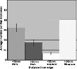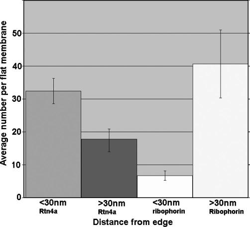 Fig. 5. Rtn4a locates to the edges of flattened membranes. The average number of gold particles on each flattened membrane structure that are located less than 30 nm from the edge was compared to those located more than 30 nm from its edge. This was compared to the distribution of the ER protein, ribophorin. Bars represent standard error of the mean.