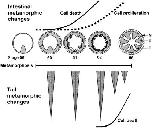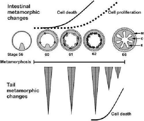 Figure 1. Schematic of Intestinal and Tail Cell Death and Cell Proliferation Events During Metamorphosis.Xenopus laevis metamorphosis begins when T3 levels elevate at stage 57 and terminates at stage 66 [26]. Top illustrations are of intestine cross-sections and are not to scale. Distances between stages are also not to scale. In response to T3 the intestine changes from a simple structure with one luminal fold (stage 56) to one with multiple folds in the post-metamorphic froglet following stage 66. As intestine metamorphosis begins ECM remodeling in the connective tissue (C) results in cell death (open circles) and cell proliferation (closed circles) of overlying epithelial cells (E). Bottom illustrations represent tail lengths during metamorphosis. Tail regression due to cell death begins at stage 62/63 and is complete by stage 66. Solid line = cell death, dashed line = cell proliferation. C = connective tissue, E = epithelial, M = muscle