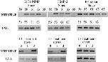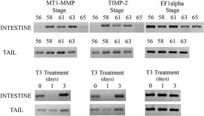 Figure 3. Representative RT-PCR Results of Similar MT1-MMP and TIMP-2 Levels of RNA During Natural and T3 Induced Metamorphosis.PCR products were agarose gel fractionated, stained, and photographed. MT1-MMP and TIMP-2 transcription patterns mimic each other at all stages and conditions. In the intestine, MT1-MMP and TIMP-2 transcripts are poorly detected at stage 56 prior to metamorphosis. Levels of both increase during stages 58, 61 and 63 and then drop to pre-metamorphic levels at stage 65. Conversely, in the tail, transcripts are detectable at stage 56, rise to stage 61, and then begin to drop at stage 63. T3 treatment induces a drop in levels after one day, but an increase after three days for both genes. EF1α RNA levels are shown for all comparable stages and treatments.