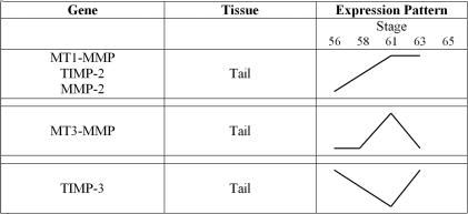 Figure 4. Patterns of MMP and TIMP RNA Levels Seen During X. laevis Tail Metamorphosis Derived From RT-PCR Data.Levels of RNA found during tail metamorphosis demonstrated that MT1-MMP, TIMP-2 and MMP-2 shared similar RNA expression patterns, peaking at stage 61 and staying elevated at stage 63. MT3-MMP and TIMP-3 expression patterns in the tail were not similar to the three other genes, nor to each other. Changes in RNA levels are not quantitative, but instead illustrate patterns of expression.