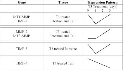Figure 5. Patterns of MMP and TIMP RNA Levels Seen During T3 Induced Metamorphosis in X. laevis Intestine and Tail as Derived From RT-PCR Data.Levels of RNA found during induced metamorphosis of the intestine and tail demonstrated that MT1-MMP and TIMP-2 shared similar RNA expression patterns, dipping after 1 day and elevating thereafter. MMP-2 and MT3-MMP also shared similar RNA expression patterns, elevating after 1 day in both the intestine and tail. TIMP-3 expression patterns were not similar between the intestine and tail, nor were they similar to the four other genes. Changes in RNA levels are not quantitative, but instead illustrate patterns of expression.