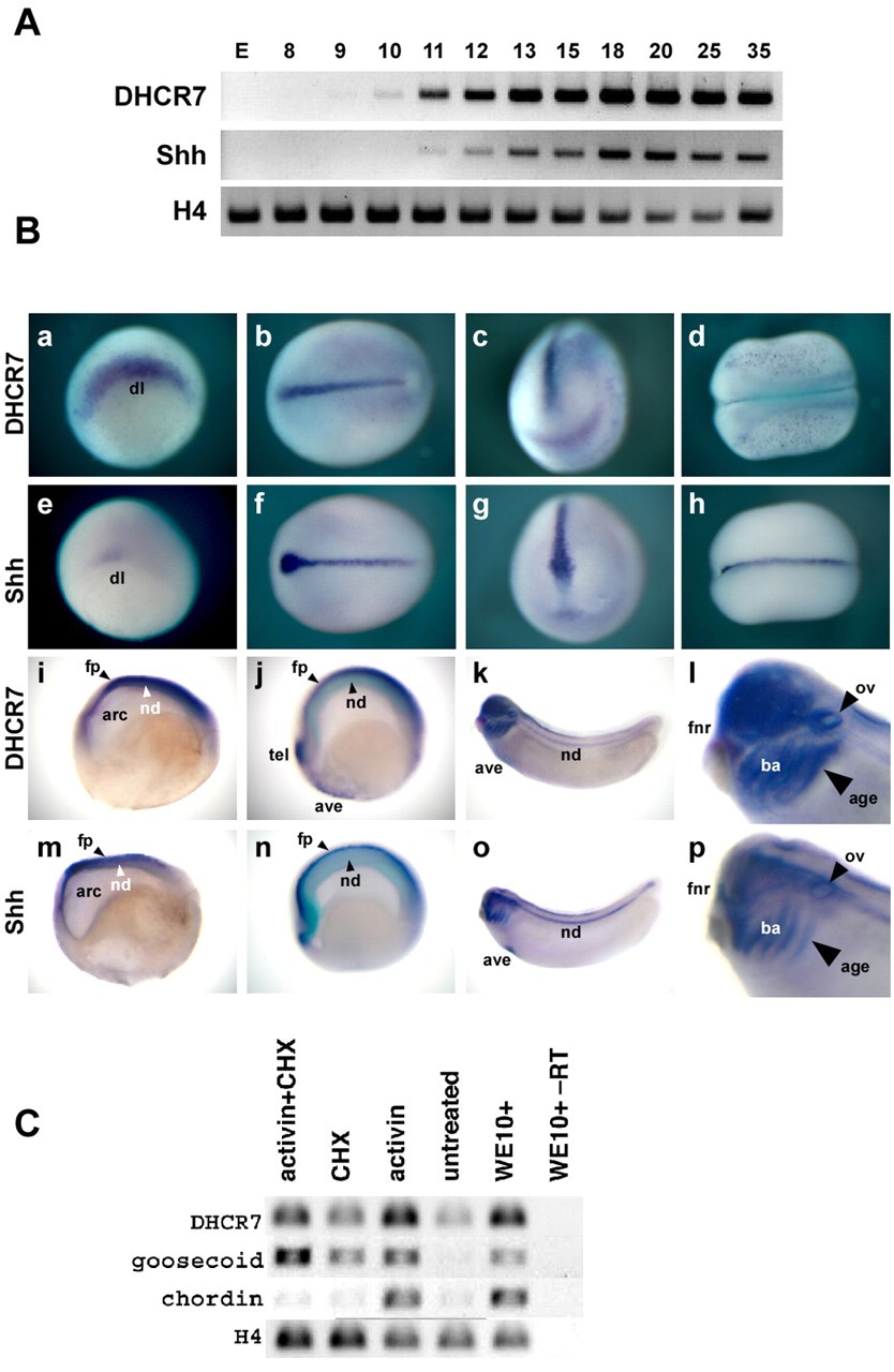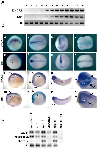 Fig. 2. Developmental expression profiles of DHCR7 and Shh. (A) RT-PCR analysis of DHCR7 and Shh expression during Xenopus development. H4, histone H4. (B) Whole-mount in situ hybridization of DHCR7 and Shh at gastrula (a,e), neurula (b-d,f-h,i,j,m,n), tadpole (k,l,o,p) stages. (a,b,d,e,f,h) Dorsal views. (c,g) Anterior views. (i-p) Lateral views with anterior towards the left and dorsal upwards. dl, dorsal lip; fp, floor plate; arc, archenteron; tel, telencephalon; ave, anterior ventral endoderm; ba, branchial arches; fnr, frontonasal region; age, presumptive anterior gut endoderm; nd, notochord; ov, otic vesicle. (C) Induction of DHCR7 by activin in animal cap explants. CHX, cycloheximide; WE, whole embryos. |