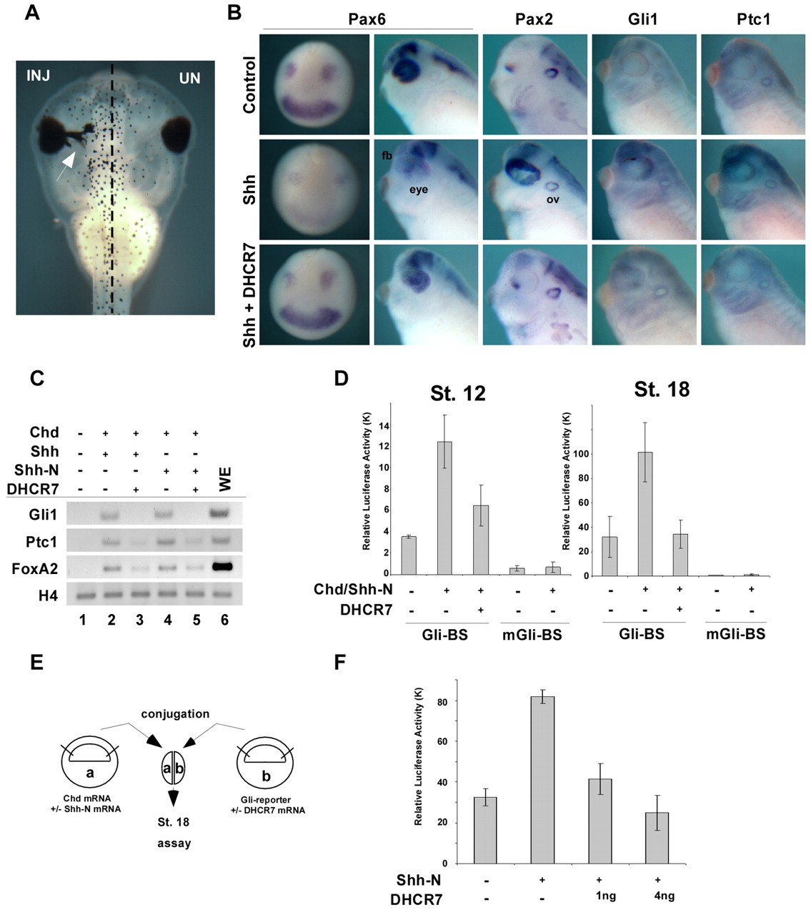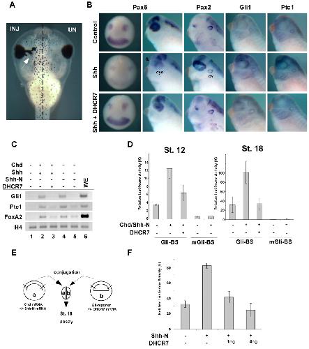 Fig. 3. Inhibition of Shh signaling by DHCR7. (A) DHCR7 mRNA (2 ng) was microinjected unilaterally into one blastomere of the two-cell stage embryo. (B) Two-cell stage embryos were injected with 250 pg of Xenopus Shh mRNA (middle row), or together with 500 pg of DHCR7 mRNA (bottom row; Shh + DHCR7). Embryos were subjected to whole mount in situ hybridization at stage 35 (tailbud) using indicated probes. When Shh mRNA was co-injected with DHCR7 mRNA, marker gene expression was restored to the wild-type level (top row). The rescue efficiency was: Pax6, 87% (n=46); Pax2, 90% (n=48); Gli1, 91% (n=34); Patched1, 93% (n=28). (C) RT-PCR analysis of RNA isolated from animals caps injected with Chordin (50 pg) plus Shh (100 pg) (lane 2), Chordin plus Shh with 1 ng of DHCR7 (lane 3), Chordin plus 100 pg of Shh-N (lane 4) and Chordin plus Shh-N with 1 ng of DHCR7 (lane 7) mRNA. Uninjected stage 28 equivalent animal cap control (lane 1). (D) Gli-reporter assays using animal cap assay. (E) Schema of a conjugation experiment. (F) Gli-reporter gene assay using animal cap conjugates. |