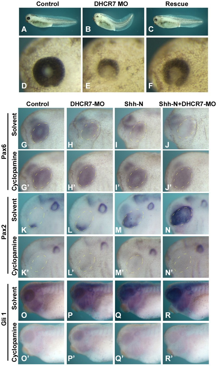 Fig. 4. Loss-of-DHCR7 affects cellular response toward Hh signaling in optic vesicle. (A-F) DHCR7 knockdown by MOs leads to eye defects. Four-cell stage Xenopus embryos were injected marginally in all four blastomeres with 5 ng of control MO (A,D), DHCR7 MOs (B,E) or DHCR7 MOs together with 125 pg of full-length DHCR7 rescue mRNA (C,F). Additional defects detected were in the heart and gut of the swimming tadpole stages (data not shown). (G-R) Loss of DHCR7 affects cellular response towards Hh signaling. Four-cell stage Xenopus embryos were injected with 20 ng of control MO (G,Gâ²,K,Kâ²,O,Oâ²), 20ng of DHCR7 MOs alone (H,Hâ²,L,Lâ²,P,Pâ²), 50 pg of Shh-N mRNA alone (I,Iâ²,M,Mâ²,Q,Qâ²) or 20 ng of DHCR7 MOs with 50 pg of Shh-N mRNA (J,Jâ²,N,Nâ²,R,Râ²). Knockdown of DHCR7 reduces Pax6 expression (G-J), expands the expression of Pax2 expression (K-N) and upregulates Gli1 expression (O-R). (Gâ²-Râ²) Continuously treatment of embryos with cyclopamine (100μ M) from the blastula stage blocks Hh signaling (G-J,K-N,O-R). Circled areas mark optic vesicles. |