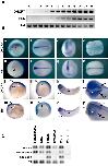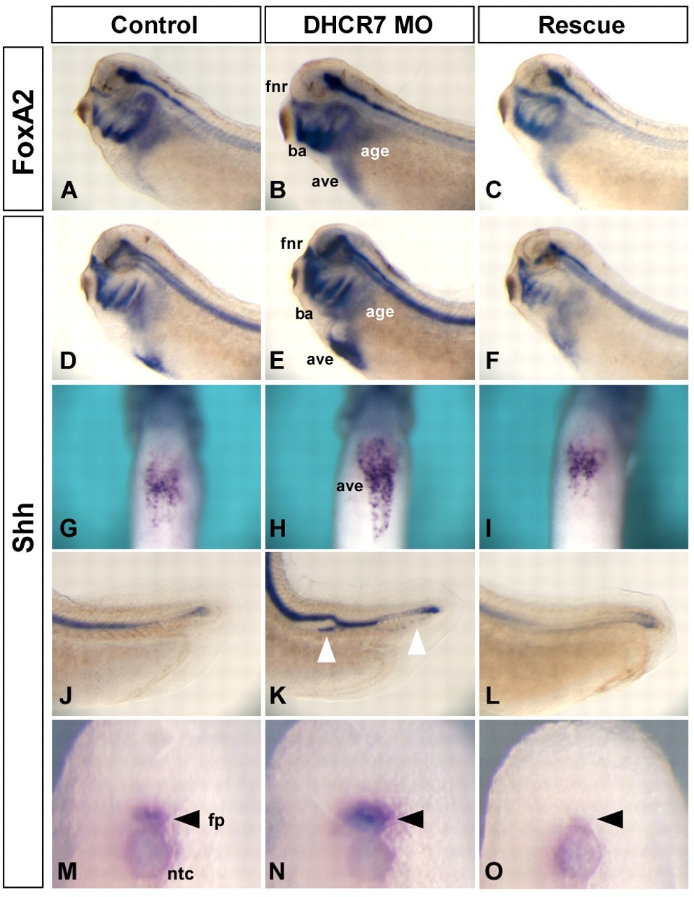 Fig. 5. Expansion of Shh and FoxA2 expressing domains in MO-injected embryos. Four-cell stage Xenopus embryos were injected with 20 ng of control MO (A,D,G,J,M), with 20 ng of DHCR7 MOs alone (B,E,H,K,N) or with 500 pg of DHCR7 rescue mRNA (C,F,I,L,O). Whole-mount in situ hybridization of the tailbud stage embryos microinjected with DHCR7-MOs shows expansion of floor plate as marked by FoxA2 (A-C) and Shh (D-O) expression. (B,E) DHCR7 MOs injected embryos expand FoxA2 and Shh expression domains in frontal nasal region, branchial arches and anterior gut endoderm. (M-O) Transverse sections of embryos indicated in D,E. (K) Ectopic expression of Shh was detected in the notochord region of DHCR7 MO injected embryos (40%, n=28). ave, anterior ventral endoderm; ba, branchial arches; fl, floor plate (arrowheads); fnr, frontonasal region; age, presumptive anterior gut endoderm. White arrowheads indicate ectopic Shh expression. |