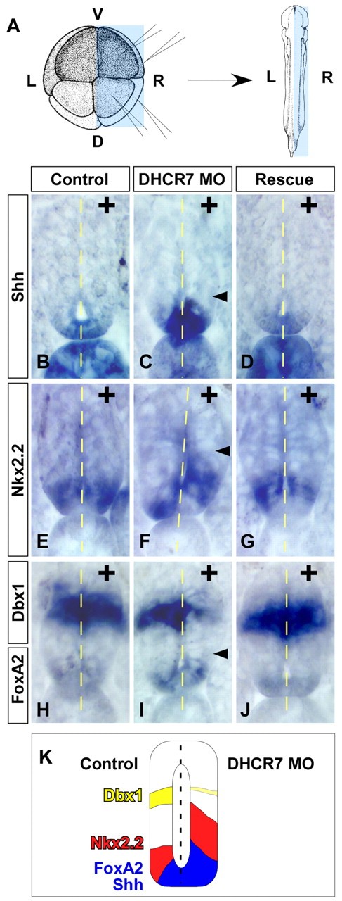 Fig. 6. Neural patterning modulated by DHCR7. (A) Schema of unilateral injection experiment. Eight-cell stage Xenopus embryos were unilaterally (right side) microinjected with 20 ng of control MO (B,E,H) or 20ng of DHCR7 MOs alone (C,F,I) or with 500 pg of DHCR7 rescue mRNA (D,G,J). Transverse section of whole-mount in situ hybridization of the tailbud stage embryos microinjected with DHCR7-MOs shows ventralization of neural tube as marked by Shh (B-D), Nkx2.2 (E-G), FoxA2 and Dbx1 (H-J) expression. Arrowheads indicate the dorsal expression limit of the indicated markers. (K) Summary of ventralization of neural tube by loss of DHCR7. |