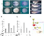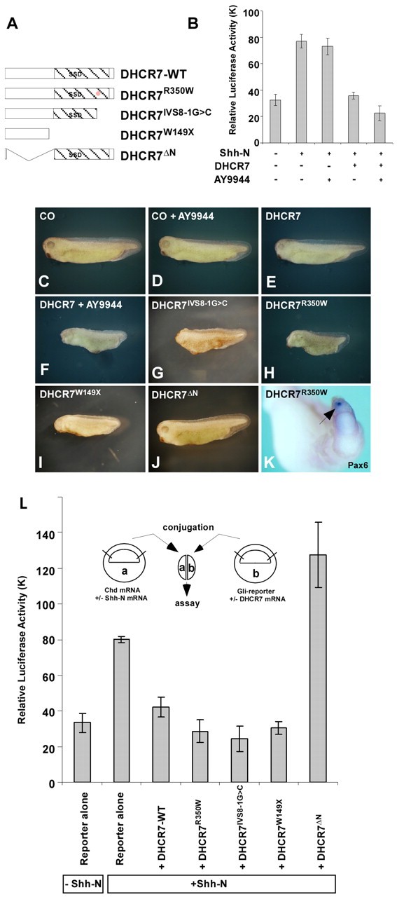 Fig. 7. Shh signaling and cholesterol synthesis. (A) Various DHCR7 mutant constructs. (B) Inhibition Hh signaling is enhanced by treatment with AY-9944. Embryos were injected with the reporter construct 8X3â²Gli-BS Luc with or without Shh-N, DHCR7 mRNA and treatment with 10 μM AY-9944. (C-J) Microinjection of DHCR7 mutants that are defective in reductase activity causes cyclopic phenotypes. The overexpression of DHCR7 mRNA (E) or treatment with AY-9944 (D) caused minor defects, but a combination of both causes severe defects (F). Embryonic phenotypes caused by microinjection of 1 ng of DHCR7R350W (H), DHCR7IVS8-1G>C (G), DHCR7δN (J) and DHCR7W149X (I) mutants. (K) Pax6 staining of tailbud stage embryos injected with DHCR7R350W. Arrow marks `cyclopic' eye. (L) Modulation of Gli reporter by DHCR7 mutants using animal cap conjugation. Embryos were injected with Chordin (with or without Shh-N mRNA) or with Gli-BS Luc (with or without DHCR7 mRNA). |