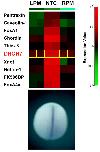 Fig. 1. Expression of DHCR7 in developing notochord. (Top) Hierarchical clustering analysis of microarray data. Each column represents a single hybridization and each row a single clone. The colors ranging from red to green correspond to increased and decreased gene expression. LPM, left presomitic mesoderm; NTC, notochord; RPM, right presomitic mesoderm. (Bottom) Whole-mount in situ hybridization revealing the expression of DHCR7 in the midline of a Xenopus neurula stage embryo. |