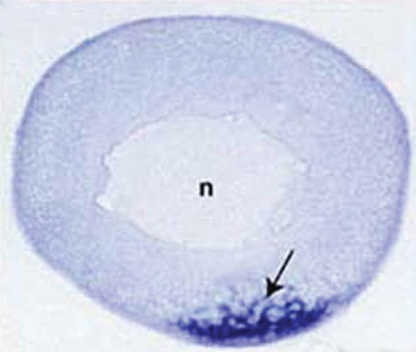 Fig. 3. Centroid mRNA localization in Xenopus oocytes. (A-C) Whole mount in situ hybridization showing localization of centroid mRNA (arrows) in the mitochondrial cloud in a stage 1 oocyte (A) and in the apex of the vegetal cortex in a stage II oocyte (B) and a stage III oocyte (C). (D- J) Sections of whole mount in situ hybridization showing localization of centroid mRNA in oocytes at different stages. (D) In a pre-stage I oocyte, centroid mRNA is uniformly dispersed in the cytoplasm but excluded from the mitochondrial cloud (long arrow) and secondary clouds (short arrows). (E,F) In a stage I oocyte, centroid mRNA (arrow) is located in the center of the mitochondrial cloud. Panel (F) shows the high magnification of the mitochondrial cloud (white sphere) with centrally located centroid mRNA (arrow). (G,H) In late stage I/early stage II and stage II oocytes, centroid mRNA is limited to the vegetal tip of the mitochondrial cloud (co- localizing with the germ plasm [long arrow]) and is excluded from the apical part of the mitochondrial cloud (short arrows). (I-K) Stage III, early stage IV and stage IV oocytes showing localization of centroid mRNA in the islands of a dispersing mitochondrial cloud (arrows). n, nucleus. Scale barsareequalto56μmin(A),90μmin(B,G),100μmin(C),70μmin(D), 75 μm in (E), 65 μm in (F), 86 μm in (H), 80 μm in (I) and 100 μm in (J,K).