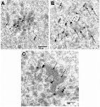 Fig. 4. Electron microscopy analysis of centroid mRNA localization in the germ plasm of Xenopus oocytes. (A) Fragment of the mitochondrial cloud in a pre-stage I oocyte hybridized with a centroid anti-sense RNA probe, labeled with nanogold and silver-enhanced showing the mitochondrial cement (long arrows) located between the mitochondria. Centroid mRNA (short arrows) is present in the mitochondrial cloud but excluded from the mitochondrial cement. (B,C) Fragment of the mitochondrial cloud from stage 2 oocytes showing centroid mRNA (short arrows) located in the vicinity (B) and at the periphery (C) of the germinal granules (long arrows). m, mitochondria.