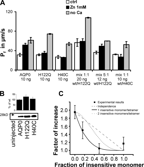 Figure 3. (A) Effect of 1 mM ZnCl2 on the water permeability of coinjected AQP0 and a mutant insensitive to zinc H122Q or H40C. Mix 1:1 represents 10 ng of wild type and 10 ng of mutant H122Q (fraction of insensitive monomer = 10 divided by [10+10] = 0.5) and mix 5:1 represents 10 ng of wild type and 2 ng of mutant H122Q (fraction of insensitive monomer = 2 divided by [10+2] = 0.166). In both mixtures, the effect of zinc was dramatically diminished but the calcium sensitivity remained intact. Mix 1:1 represents 5 ng of wild type and 5 ng of mutant H40C. (B) Western Blot of uninjected oocyte membranes, AQP0, mutant H122Q, and mutant H40C. A band, lower than the 28 kD marker, was seen in AQP0, H122Q, and H40C and not seen in uninjected oocytes. The bar graphs represent the average of scanned bands from three different experiments. There was no noticeable difference between the wild type and the mutant expression level. (C) Theoretical curves predicting the factor of increase, assuming the monomers behave independently (gray dashed line) or one or two insensitive monomers can block zinc sensitivity (black continuous line and gray dotted line respectively). Experimental results are plotted as filled squares and are well fit by the one insensitive monomer curve. Each data point is the average of experiments using nine oocytes from three different batches.