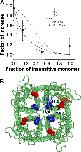 Figure 4. (A) Plots of biased binomial predictions of the factor of increase assuming that two insensitive monomers are required to render the heterotetramer insensitive to zinc. Curves are shown for incorporation of mutant AQP0 in the heterotetramer biased by 0, 1, 2, 3, or 4 kT per contact face. Only the 2 kT curve fits the experimental data. (B) Overview of AQP0 tetramer structure. His40 is shown in blue and His122 in red. The tetramer is shown from the extracellular side looking down the pores. The coordinates used to generate the figure were from the published structure of AQP0 (PDB: 6B0P). We used proteinexplorer.org (http://molvis.sdsc.edu/protexpl/frntdoor.htm).