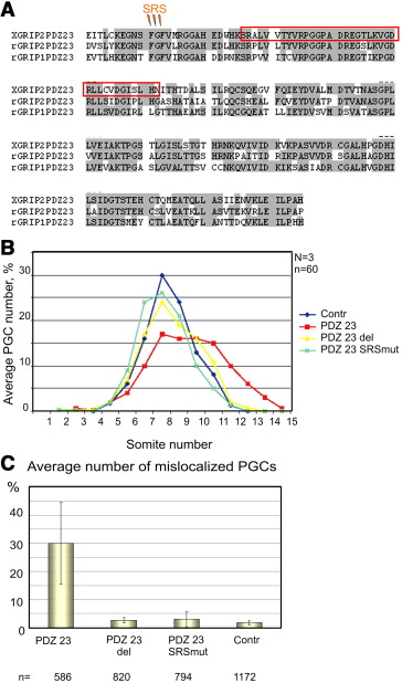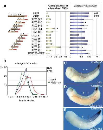 Misexpression of the putative dominant negative XGRIP2.1 fragment PDZ 23 impairs normal PGC development and migration. (A, B, D) Embryos were injected vegetally into both blastomeres of the 2-cell stage. (A) Injection of synthetic mRNAs (2 fmol each) encoding for a series of putative dominant negative protein fragments of XGRIP2.1 results in a reduced average PGC number and mislocalization of PGCs. ââp(t) < 0.1 for average numbers of mislocalized PGCs and p(t) < 0.05 for average PGC numbers. (B) The PGC migration profile of uninjected control embryos (stage 32â33) (dark blue curve) and embryos injected with PDZ 23 RNA (2 fmol) alone (red curve) or together with XGRIP2.1 ORF RNA (0.2 ng) (green curve). (C) An uninjected control embryo (stage 33) illustrating the borders (somite numbers, white lines) of normal PGC positioning along the A/P axis. (D) An extreme example of an embryo injected with 2 fmol of PDZ 23 RNA exhibiting mislocalization of PGCs. (E) A representative example of an embryo injected with 2 fmol of PDZ 23 RNA exhibiting mislocalization of PGCs. Nânumber of independent injections, nânumber of embryos analyzed in each experiment. |